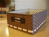 ふたつきなのでとっても便利です。 茶系ペーパーの編みこみが木のぬくもりを感じ、水玉模様の布が魅力的。